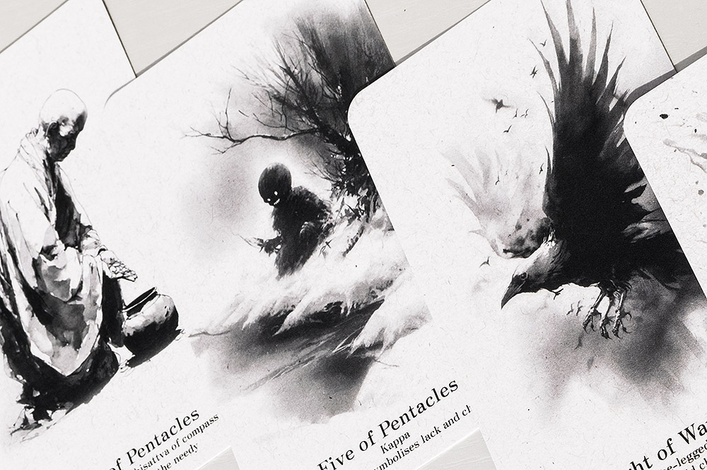 Both decks are illustrated in traditional black ink sumi-e style, printed on uncoated recycled paper to preserve the raw texture of brush and breath. They follow the classical tarot structure, but each card is expanded with Japanese poetry, Zen philosophy, and mythic symbolism.This campaign is my invitation to you — to walk the path of clouds, to walk the path of gods.